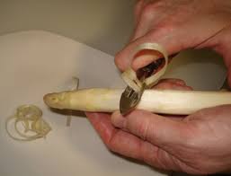 - Limpiar y pelar los espárragos con ayuda de un pelador desde tallo hacia la punta.
